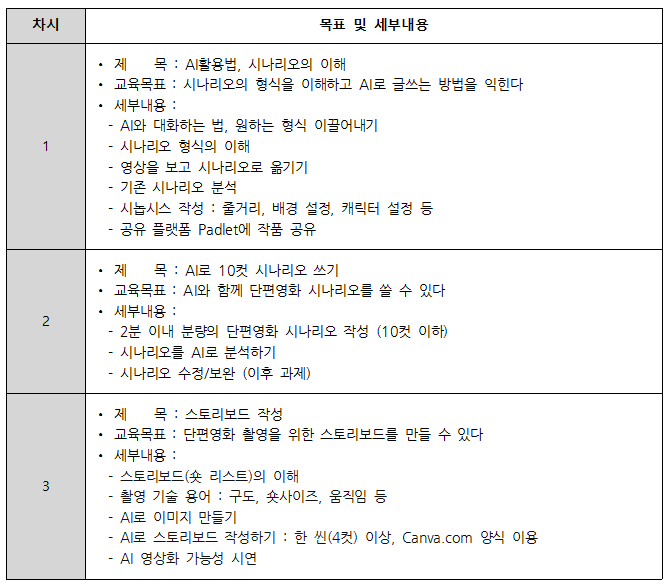 | 2024-10-01~2024-10-01 | 동서울대 디지털방송콘텐츠학과 | AI 활용 콘텐츠 제작 교육 특강(교수진 대상) |
