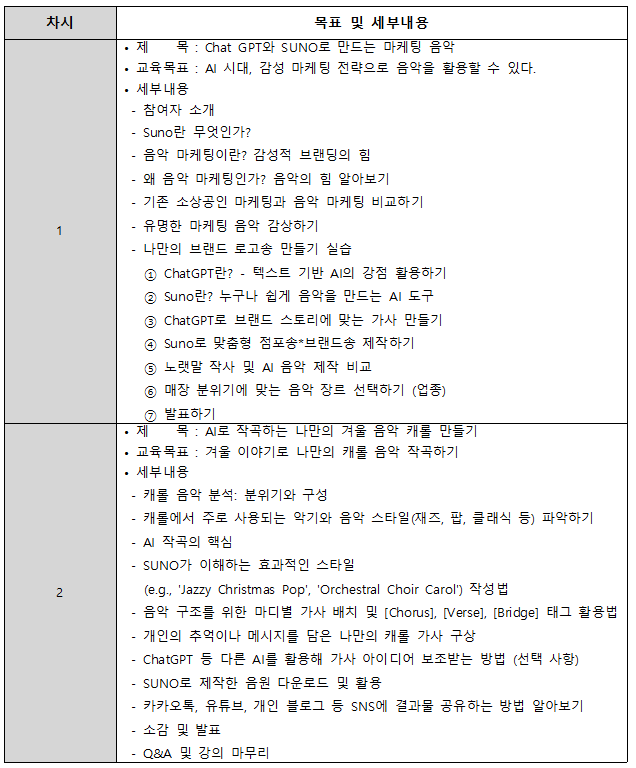 - AI 앱 SUNO 를 활용하여 '마케팅 송' 또는 '캐롤 송'을 제작하는 실습 교육입니다.