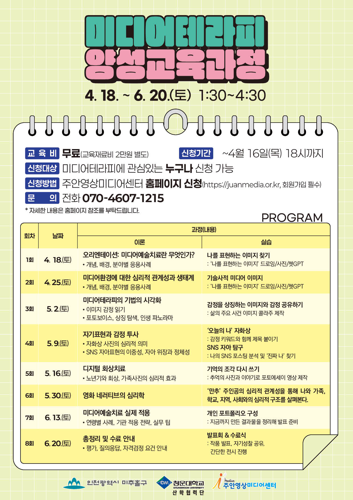 | 1회 | 04월 18일(토) | 오리엔테이션: 미디어예술치료란 무엇인가? - 개념, 배경, 분야별 응용사례 |
